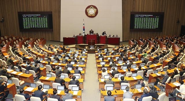 13일 오전 국회 본회의에서 미세먼지 저감 및 관리에 관한 특별법 일부개정법률안이 통과되며 본회의장 상황판에 투표 현황이 나타나고 있다.