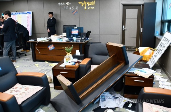 금속노조 대우조선지회 노조원들이 13일 경남 거제시청 시장집무실에 들어가 집기 등 던지면서 시장실이 아수라장이 됐다.