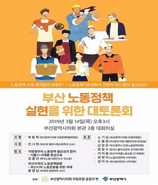 부산광역시의회 의정포럼 ‘공공의 벗’(회장 도용회 의원)은 3월 14일(목) 15:00 시의회 대회의실에서 부산의 노동정책 방향에 대한 현장, 전문가, 시민사회 의견 수렴을 통해 올바른 방향을 모색하기 위한 ‘부산 노동정책 실현을 위한 대토론회’를 부산시와 함께 공동으로 개최한다고 밝혔다.