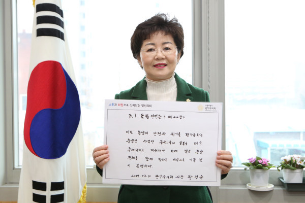 [시민일보=고수현 기자] 왕정순 서울 관악구의장이 최근 '3.1 독립선언서 필사챌린지'에 동참했다.