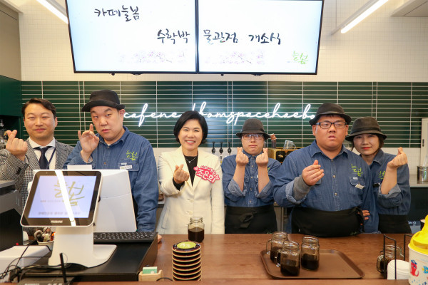 서울 서초구가 지난 12일 방배동 수학박물관에 ‘늘봄카페 13호점’을 문 열었다. 늘봄카페는 한우리보호작업장에서 운영하는 것으로, 발달장애인 바리스타 3명과 경력단절 여성 매니저 1명이 함께 근무한다. 사진은 개소식에 참여한 조은희 구청장(왼쪽에서 세 번째)이 카페 직원들과 기념촬영하는 모습. (사진제공=서초구청)