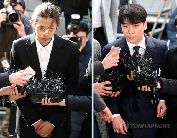 성관계 동영상 불법 촬영·유포 논란을 빚은 가수 정준영이 피의자 신분으로 조사를 받기 위해 14일 오전 서울지방경찰청으로 들어서며 취재진 질문에 답하고 있다(왼쪽). 성접대 의혹이 불거진 빅뱅 멤버 승리(본명 이승현)가 피의자 신분으로 조사를 받기 위해 14일 오후 서울지방경찰청으로 출석하고 있다.