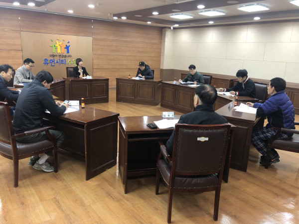 경기 수원시 영통구는 15일 구청 상황실에서 2019 영통구청장기(배) 국민생활체육대회 종목별 관계자 회의를 개최했다. 이번 회의에는 9개 종목(축구·족구·테니스·농구·탁구·테니스·볼링·게이트볼·그라운드골프) 관계자가 참석했다. 사진은 참석자들이 이야기를 나누는 모습. (사진제공=수원시청)