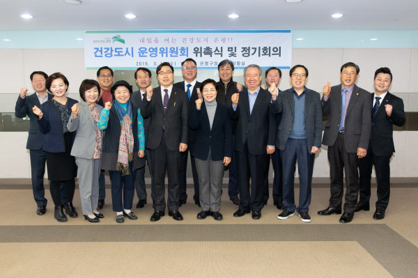 최근 은평구가 구청 기획상황실에서 ‘건강도시운영위원회’ 위원 위촉식을 열고 지속가능 발전 건강도시로의 도약을 위한 힘찬 발돋움을 내디뎠다. 사진은 김미경 구청장이 건강도시운영위원들과 함께 기념촬영을 하고 있는 모습. (사진제공=은평구청)