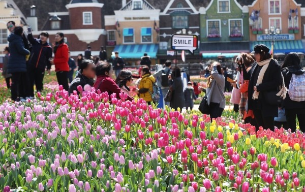 17일 오후 경기도 용인시 에버랜드에서 열리고 있는 튤립 축제를 찾은 시민들이 활짝 핀 튤립을 보며 봄 정취를 만끽하고 있다.