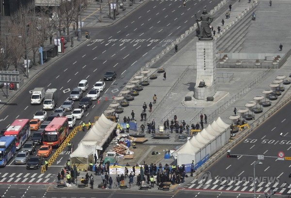 | ▲ 18일 오전 서울 광화문광장에서 세월호 천막 철거작업이 한창이다. 세월호 천막은 2014년 7월 처음 설치된 후 약 4년 8개월 만에 유가족 측의 자진철거 의사에 따라 이날 모두 철거됐다. /연합뉴스 | ||