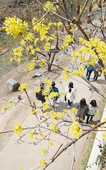 낮 기온이 평년 보다 오르며 큰 일교차를 보이는 18일 오후 서울 청계천에 산수유가 활짝 피어있다. /연합뉴스