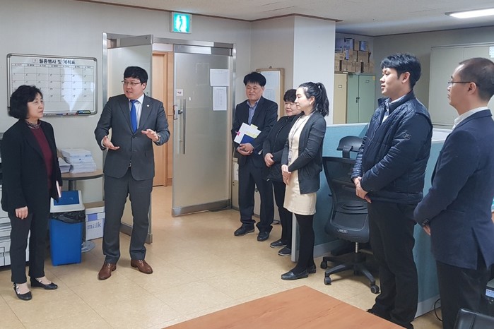 이관수 서울 강남구의장(왼쪽 두번째)이 지난 4일 체육 및 주차 관련 시설을 관리하는 공기업인 강남구 도시관리공단을 방문해 이날 청사를 돌아보며 직원들의 애로사항을 청취한 이관수 의장은 “열악한 조건에서도 구민편익 증진을 위해 노력해주시는 직원들에게 감사 드린다” 며 직원들을 격려하고 감사 인사를 전했다.(사진제공=강남구의회)