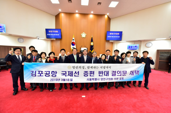 이날 김포공항 국제선 증편 반대 결의는 최근 서울시의 김포공항 활성화 조례 제정 및 서울시의회 김포공항 활성화 특별위원회 구성 결의안 통과에 따라 김포공항 활성화 추진 방안에 국제선 증편 등이 언급되면서 항공기 소음으로부터 양천구민의 피해가 가중될 것으로 예상됨에 따라 긴급하게 진행됐다.