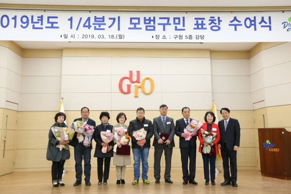 서울 구로구가 18일 '2019년도 1분기 모범구민 표창 수여식'을 열고 지역사회 발전을 위해 헌신적으로 봉사한 주민들에게 표창을 수여했다. 사진은 이성 구청장(오른쪽)이 표창 수여 후 주민들과 함께 기념촬영을 하는 모습. (사진제공=구로구청)