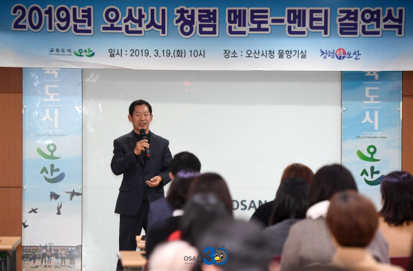 경기 오산시는 19일 시청 물향기실에서 신규 공무원의 조직적응력을 향상시키고, 소통·공감하는 조직문화를 만들어 청렴오산 이미지 제고를 위한 '청렴 멘토-멘티 결연식'을 가졌다. 사진은 행사에 참여한 김문환 부시장이 인사말을 하고 있는 모습. (사진제공=오산시청)