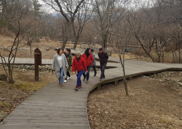 경기 수원시 권선구는 18일 윤경선 시의원, 녹지공원과장 및 담당직원 등 6명이 참석한 가운데 오감발달 숲 놀이터 도입을 위해 '용인 자연휴양림 유아 숲체험원'을 답사했다. 사진은 참여자들이 유아 숲체험원을 둘러보고 있는 모습. (사진제공=수원시청)