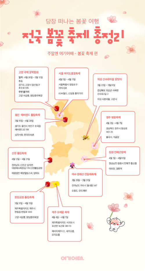 더불어 여기어때는 전국 봄꽃축제를 한 데 모았다. 용인 에버랜드 튤립축제와 의성 산수유마을 꽃맞이, 경주 벚꽃축제, 제주 유채꽃 축제, 제주 유채꽃 축제 등 10곳이다. 축제 시기와 위치, 주변 즐길거리를 동시에 소개해 봄맞이 여행을 떠나는 데 도움을 준다.