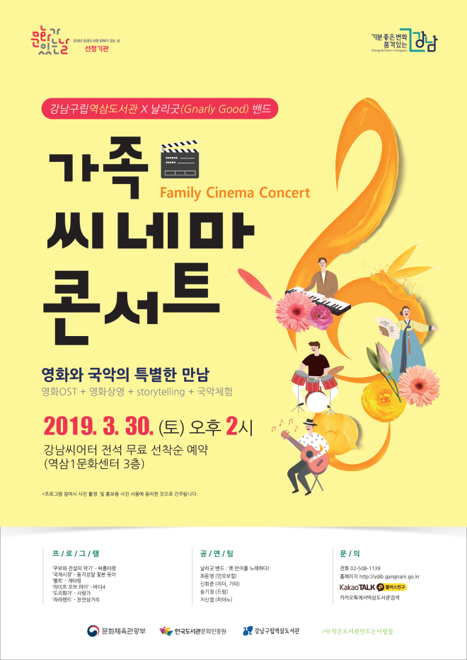 ‘가족 씨네마 콘서트’는 초등학생 이상이면 누구나 참여 가능하며, 참여를 원하는 사람은 강남구립 역삼도서관 홈페이지에서 신청하거나 전화로 문의하면 된다.