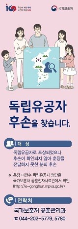 <독립유공자 후손 찾기 캠페인>을 통해 우리 국민들의 선대 중 독립운동 여부를 확인했다면 국가보훈처 홈페이지(www.mpva.go.kr) 공훈전자사료관의 <독립유공자 후손 찾기>에서 독립운동을 했던 선대의 명단을 확인하고 보훈처에 후손여부 확인신청을 할 수 있으며, 자세한 사항은 전화(☎1577-0606)를 통해 안내 받을 수 있다.