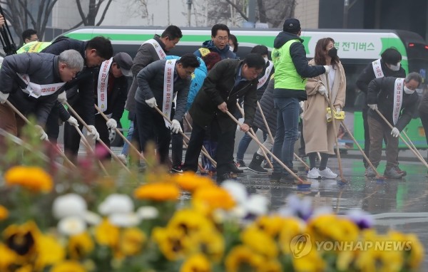 초미세먼지 주의보가 발령된 20일 오전 광화문광장에서 서울시·종로구 직원들과 시민들이 미세먼지 제거 물청소를 하고 있다.