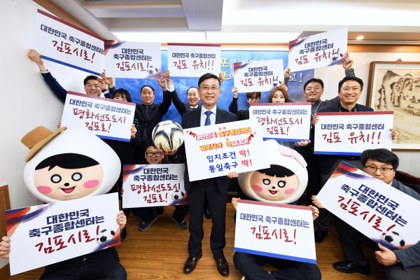 최근 정하영 김포시장과 김포시의회 의원들이 축구종합센터 유치를 위한 ‘축구종합센터 김포유치 기원 챌린지’를 시작했다. 사진은 정 시장과 시의원들이 축구종합센터 유치관련 문구가 적힌 판넬을 들고 포즈를 취하고 있는 모습. (사진제공=김포시청)