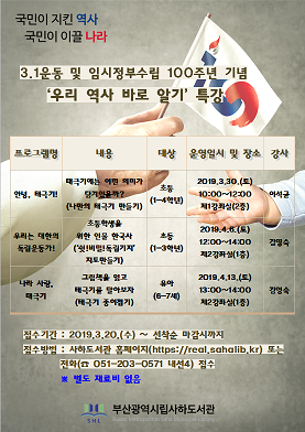 부산광역시립사하도서관(관장 공은희)은 3.1운동 100주년을 기념해 오는 3월 30일부터 4월 13일까지 6~7세 유아와 초등 1~4학년 학생들을 대상으로 ‘우리 역사 바로 알기’ 특강을 개최한다.