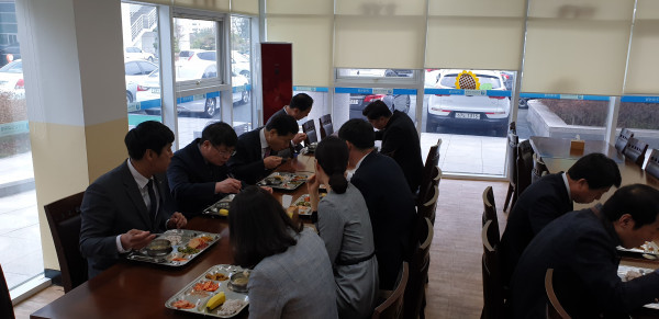 [남악=황승순 기자]장석웅 전남도교육감이 21일 점심식사를 위해 구내식당을 찾았다. 장 교육감은 교육감 취임과 함께 외부 행사 일정이 없는 날은 구내식당을 이용하고 있다. 사진은 장 교육감(첫째 줄 왼쪽 세번 째)이 식사를 하며 직원들과 이야기를 나누는 모습.(사진제공=황승순 기자)