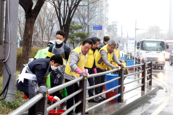 20일 정순균 서울 강남구청장이 삼성동 일대에서 실시된 ‘2019년 강남구 새봄맞이 대청소’에 직원 1500여명과 함께 참여해 겨울 동안 차도, 보도, 공공시설물에 쌓인 먼지와 각종 찌든 때를 청소했다. 사진은 구청 직원들과 함께 가드레일 등의 공공시설물을 물청소하고 있는 정 구청장의 모습. (사진제공=강남구청)