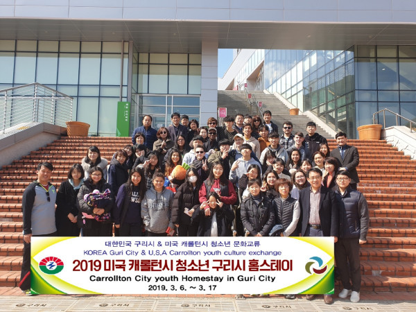 최근 경기 구리시에 방문한 ‘2019년 캐롤턴시 청소년 홈스테이 교류단’이 12일간의 일정을 마치고 본국으로 돌아갔다. 이들은 방문기간 중 전통공예 수업 참여, 한국 역사 전통 체험활동 등을 했다. 사진은 교류단이 기념촬영을 하는 모습. (사진제공=구리시청)