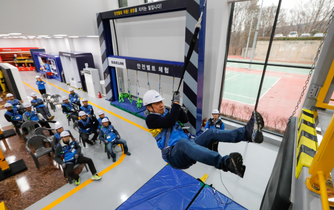 | ▲ 대림 임원이 완강기 착용법을 숙지하고 하강하는 실습 교육을 받고 있다. | ||