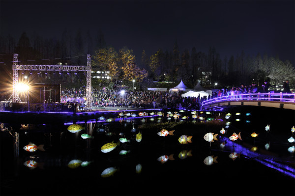 공연 중간 해가 저물면 점등식이 진행된다. 양재천 주변의 조형물과 벚꽃길의 LED 조명이 불을 밝히며 낮보다 더욱 아름다운 양재천의 봄을 느낄 수 있다.