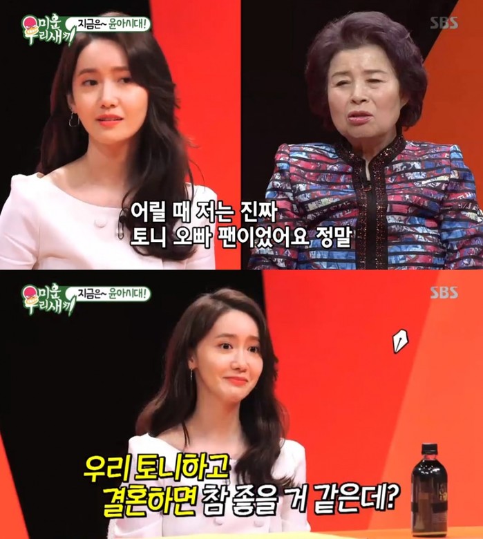 한편, 신동엽이 누구를 제일 좋아했냐고 묻자 윤아는 "어릴때 토니를 가장 좋아했다"고 답했다. 토니 어머니는 "우리 토니가 착하다며 그럴줄 알았다"고 웃음을 자아냈다. 이어 "토니와 결혼하면 좋을 것 같다"고 이야기 하자 윤아는 당황스러운 표정을 지어보이며 웃음을 터트렸다.