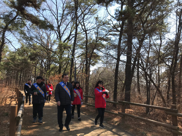 경기 수원시 영통구는 '봄철 산불 조심기간(2월1일~5월15일)'을 맞아 지난 22일 이의배수지 인근 등산로에서 시민을 대상으로 산불예방 캠페인을 실시했다. 사진은 캠페인에 참여한 송영완 구청장(가운데) 및 관계자들이 등산로를 걷고 있는 모습. (사진제공=영통구청)
