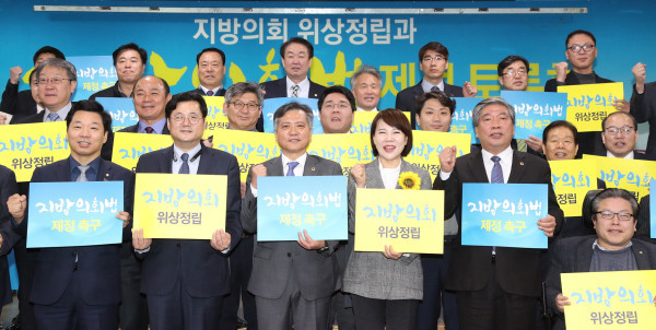송한준 경기도의장이 최근 국회의원회관 제2소회의실에서 열린 ‘지방의회법 제정 촉구를 위한 국회 토론회’에 참석해 지방의회법 제정을 촉구하는 퍼포먼스를 펼치고 있다. 이날 토론회에는 전현희·홍익표 국회의원과 광역의원, 관련 학회 관계자 등 100여명이 참석했다. (사진제공=경기도의회)