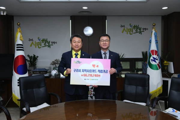경기 구리시는 25일 시청 3층 민원상담실에서 농협은행 구리시지부로부터 ‘2018년 구리시 지역사랑카드 적립기금’을 전달받았다. 이번 적립기금은 시민들을 위한 사업비 등으로 쓰일 예정이다. 사진은 안승남 시장(왼쪽)과 은행 관계자가 기념촬영을 하는 모습. (사진제공=구리시청)