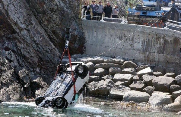 | ▲ 26일 강원 강릉시 옥계면 금진리 헌화로에서 가드레일을 뚫고 바다로 추락한 승용차를 경찰이 인양하고 있다. 이날 사고로 10대 5명이 숨졌다. /연합뉴스 | ||