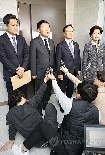 국회 사법개혁특별위원회 바른미래당 간사인 오신환 의원(왼쪽부터), 바른미래당 김관영 원내대표, 더불어민주당 홍영표 원내대표, 사법개혁특별위원회 더불어민주당 간사인 백혜련 의원이 26일 오전 국회 의원회관 홍영표 의원실에서 공수처 설치법과 검경수사권 조정 관련 쟁점을 논의하기 위한 회동을 마치고 취재진에게 브리핑하고 있다.