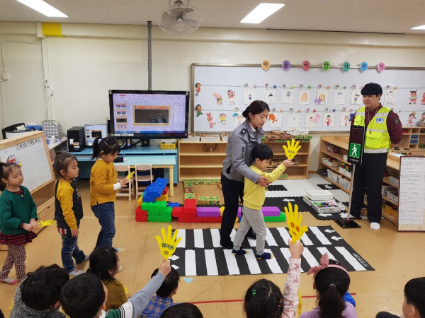 경기 부천원미경찰서는 최근 중앙초등학교 병설유치원에서 어린이 보행사고를 예방하기 위해 자체 제작한 보행안전수칙 율동 교육 및 1대1 횡단보도 체험교육 등을 실시했다. 사진은 어린이들이 '횡단보도 안전하게 건너기' 교육을 받고 있는 모습. (사진제공=부천원미경찰서)