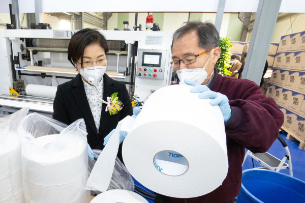 서울 은평시니어클럽은 고령자친화기업 ‘시니어페이퍼팩토리협동조합’을 설립, 노인의 안정적인 소득보장과 일자리 창출을 위해 지난 25일 공장 개소식을 열었다. 사진은 김미경 구청장(왼쪽)이 점보롤화장지 유통과정을 살펴보는 모습. (사진제공=은평구청)