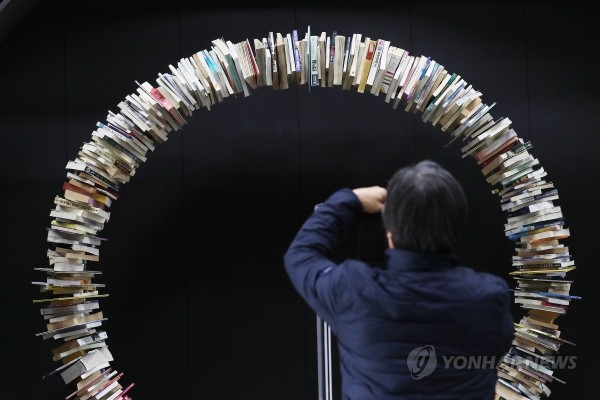 27일 오전 서울 송파구 신천유수지 창고를 리모델링한 공공 헌책방 '서울책보고'에서 한 시민이 헌책으로 만든 조형물을 촬영하고 있다. 서울책보고는 '책벌레'를 형상화한 구불구불한 긴 통로를 따라 양옆으로 철제 서가 32개를 설치한 국내 최초의 공공 헌책방이다.