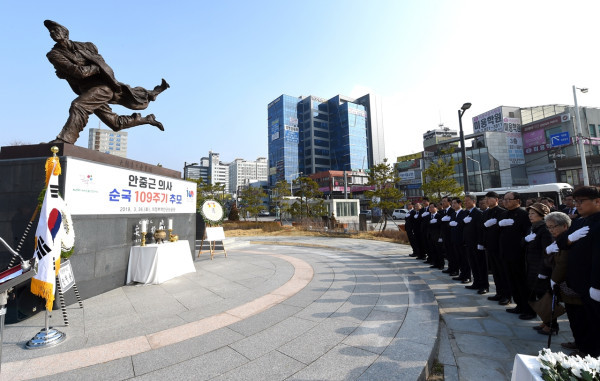 경기 의정부시는 26일 역전근린공원 안중근 동상 앞에서 안병용 시장을 비롯한 광복회 의정부시지회 회원 등이 참석한 가운데 안중근 의사 순국 109주기 추모식을 개최했다. 행사는 안중근 의사 유언 낭독 등으로 진행됐다. 사진은 참석자들이 국민의례를 하는 모습. (사진제공=의정부시청)