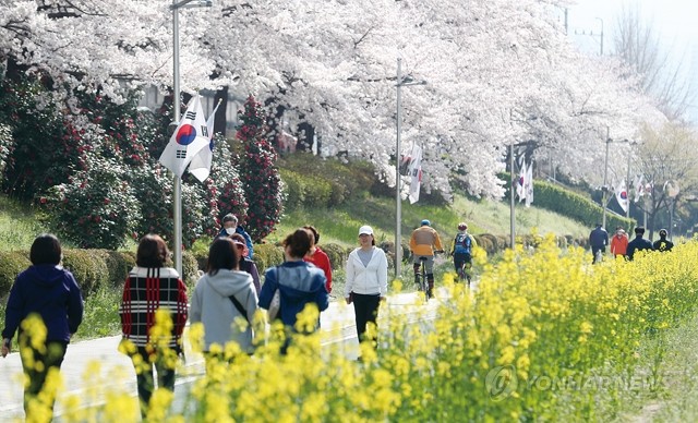 화창한 봄 날씨를 보인 27일 부산 온천천 시민공원에서 시민들이 활짝 핀 벚꽃과 유채꽃 아래 산책 하고 있다.