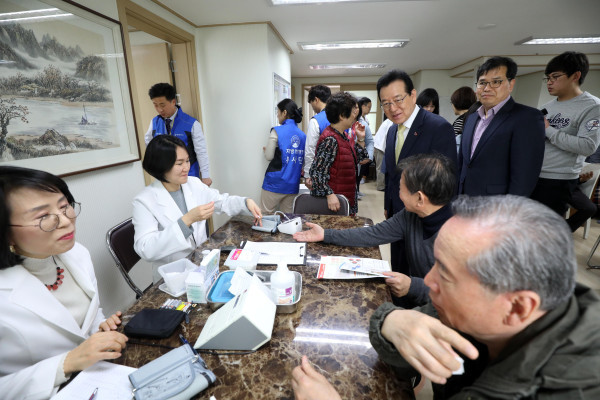 27일 서울 강남구 세곡동의 한 경로당에서 ‘2019 무병장수 백세시대 순회진료’가 실시됐다. 사진은 정순균 구청장이 진료현장을 방문해 노인들과 인사를 나누고 있다. (사진제공=강남구청)