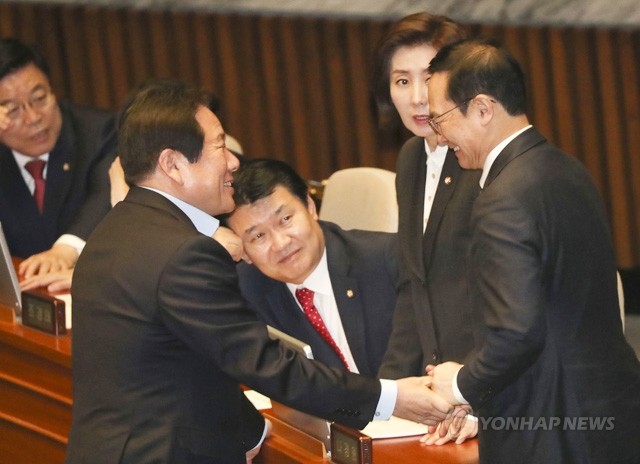 더불어민주당 홍영표 원내대표(오른쪽)가 28일 오후 국회 본회의에서 자유한국당 나경원 원내대표를 찾아가 이야기하고 있다.