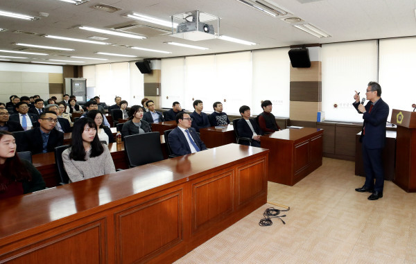 인천시의회가 29일 권혁철 인천언론인클럽 회장을 강사로 초빙해 시의원, 의회사무처 공무원 등 80여명을 대상으로 인문학 특강을 실시했다. 사진은 권 강사의 강의를 듣고 있는 특강 참여자들의 모습. (사진제공=인천시의회)