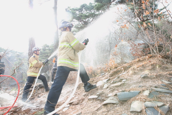 서울 도봉소방서는 최근 북한산국립공원의 도봉산 일대에서 구청, 국립공원공단, 도봉경찰서, 제2997부대, 119특수구조단, 도봉의용소방대 관계자 등이 참여한 ‘봄철 유관기관 합동 산불진압훈련·캠페인’을 실시했다. 사진은 훈련을 하는 모습. (사진제공=도봉소방서)