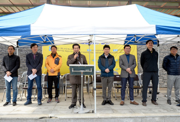경기 의정부시는 지난 30일 지역내 직동축구장에서 ‘2019 의정부시장배 공공기관 친선 축구대회’를 개최했다. 사진은 이날 대회에 참여한 안병용 시장(왼쪽 네 번째)이 인사말을 하고 있는 모습. (사진제공=의정부시청)