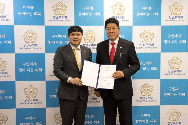 | ▲ 1일 의장실에서 이관수 의장(왼쪽)이 이호귀 의원에게 결산검사 위원 위촉장을 수여하고 기념촬영을 하고 있다. (사진제공=강남구의회) | ||