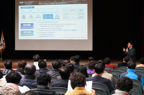 동대문구는 1일 구청 2층 다목적강당에서 서울시 주관으로 ‘제2차 서울시 도시철도망 구축계획(안) 주민설명회’를 개최했다. 사진은 서울연구원 윤혁렬 선임연구위원이 제2차 도시철도망 구축계획 수립 지침 변경사항에 대해 설명하는 모습. (사진제공=동대문구청)