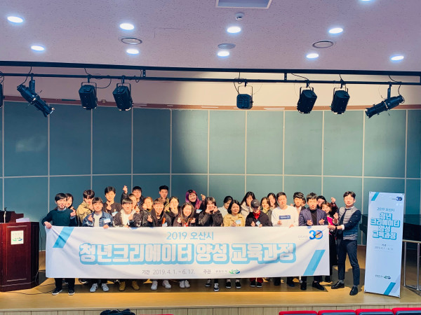 경기 오산시는 1일 중앙동행정복지센터에서 지역내 20~39세 청년 30여명이 참석한 가운데 2019년 청년크리에이터 교육과정 개강식을 진행했다. 사진은 개강식에 참여한 관계자들이 기념촬영을 하는 모습. (사진제공=오산시청)