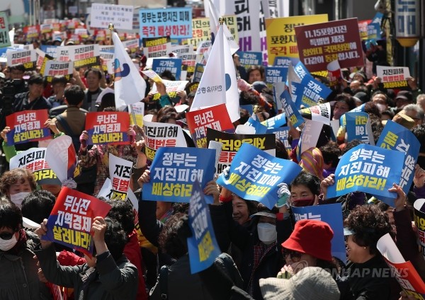 2일 오후 경북 포항시 북구 덕산동 육거리에서 열린 포항 11.15지진 특별법 제정 촉구를 위한 범시민 결의대회에서 시민들이 구호를 외치고 있다.