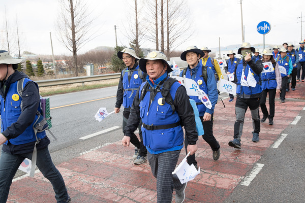서울 영등포구의회는 최근 3.1운동 및 임시정부수립 100주년을 기념해 구청에서 주최한 ‘탁트인 국토대장정’에 참여해 화성 팔탄초등학교~평택시청 코스를 완주했다. 사진은 윤준용 의장(가운데)과 의원들이 행군하고 있는 모습. (사진제공=영등포구의회)
