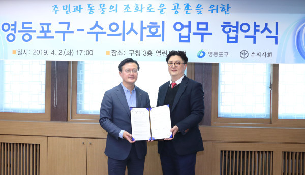 영등포구가 지난 2일 오후 구청 열린사랑방에서 영등포구 수의사회와 업무협약을 체결하며 지속가능한 동물복지 정책 추진을 위해 상호협력할 것을 약속했다. 사진은 채현일 구청장(왼쪽)과 수의사회 대표가 기념촬영을 하는 모습. (사진제공=영등포구청)