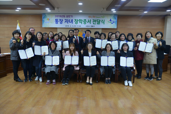 경기 수원시 영통구는 3일 구청 2층 상황실에서 2019년 상반기 통장자녀 장학금 수혜자 20명에게 장학증서를 전달하는 시간을 가졌다. 사진은 송영완 구청장 및 참여자들이 기념촬영을 하는 모습. (사진제공=수원시청)